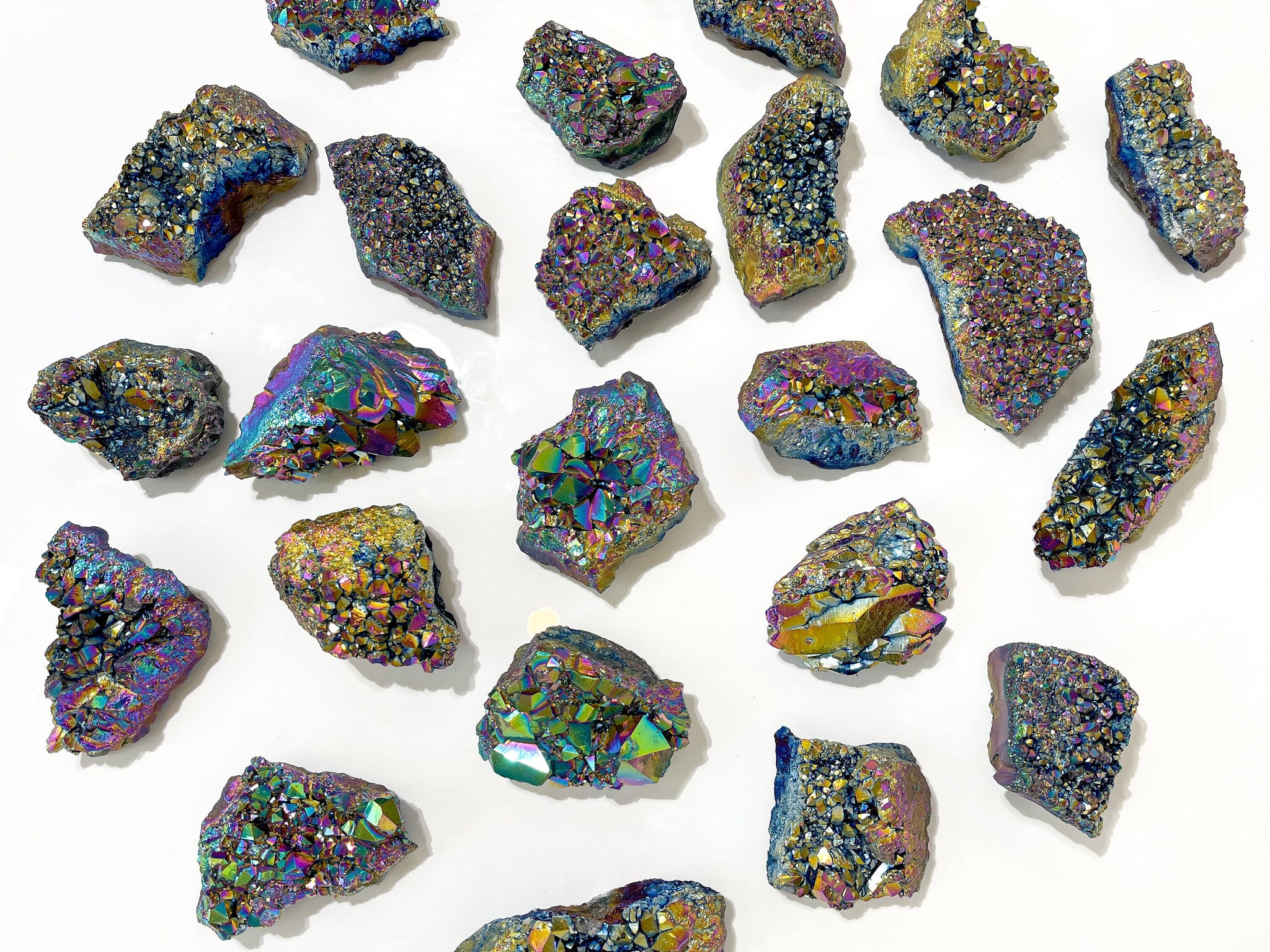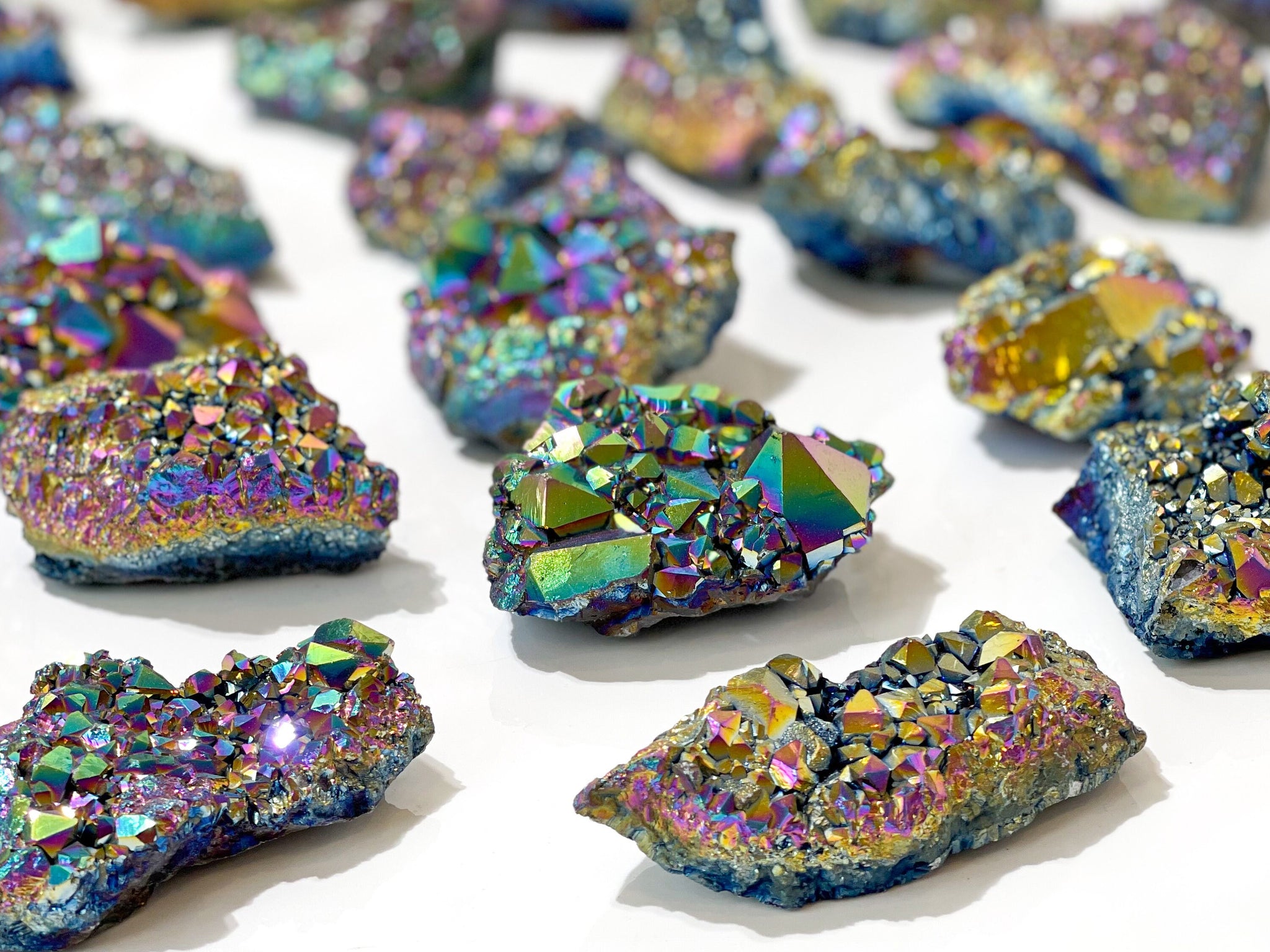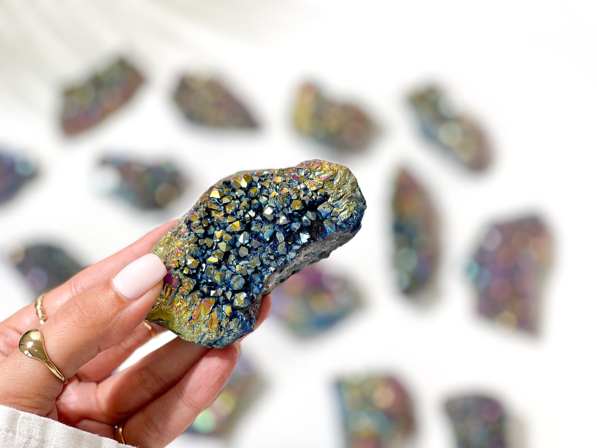 Rainbow amethyst aura, also known as amethyst with rainbow titanium coating, is a unique and stunning variation of the traditional purple amethyst. The crystal is treated with a special process that bonds titanium to its surface, resulting in a rainbow of iridescent colors that shimmer and change in different lighting. This type of amethyst is believed to have healing properties similar to regular amethyst, such as promoting calm and balance, but with the added benefit of enhancing the energy of the aura. It's a perfect addition to any crystal collection or as a gift for a loved one. The rainbow amethyst aura is also known to be a powerful tool for meditation and spiritual growth.