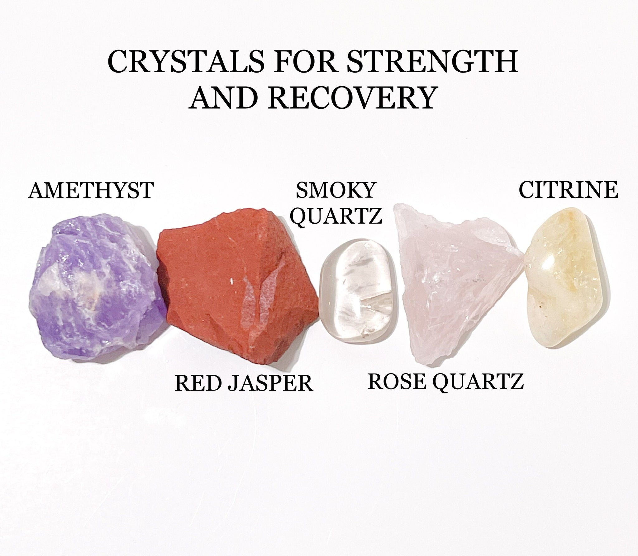 "Empower your journey to strength and recovery with our carefully curated Strength & Recovery Crystal Set. This powerful assortment includes Amethyst, Citrine, Smoky Quartz, Red Jasper, and Rose Quartz - each selected for their unique energetic properties that promote healing, balance, and personal empowerment. Ideal for those seeking to overcome challenges, restore inner harmony, and enhance resilience, these healing crystals are perfect for meditation, reiki, chakra work, and spiritual practices.