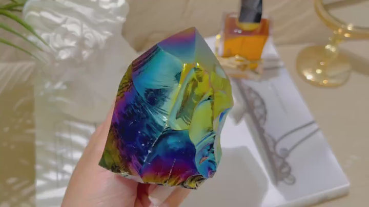 Rainbow Aura Black Obsidian Crystal Towers are a beautiful addition to any crystal collection. They are made by bonding titanium and gold to the surface of a black obsidian crystal, giving it a rainbow effect and making it a titanium...
