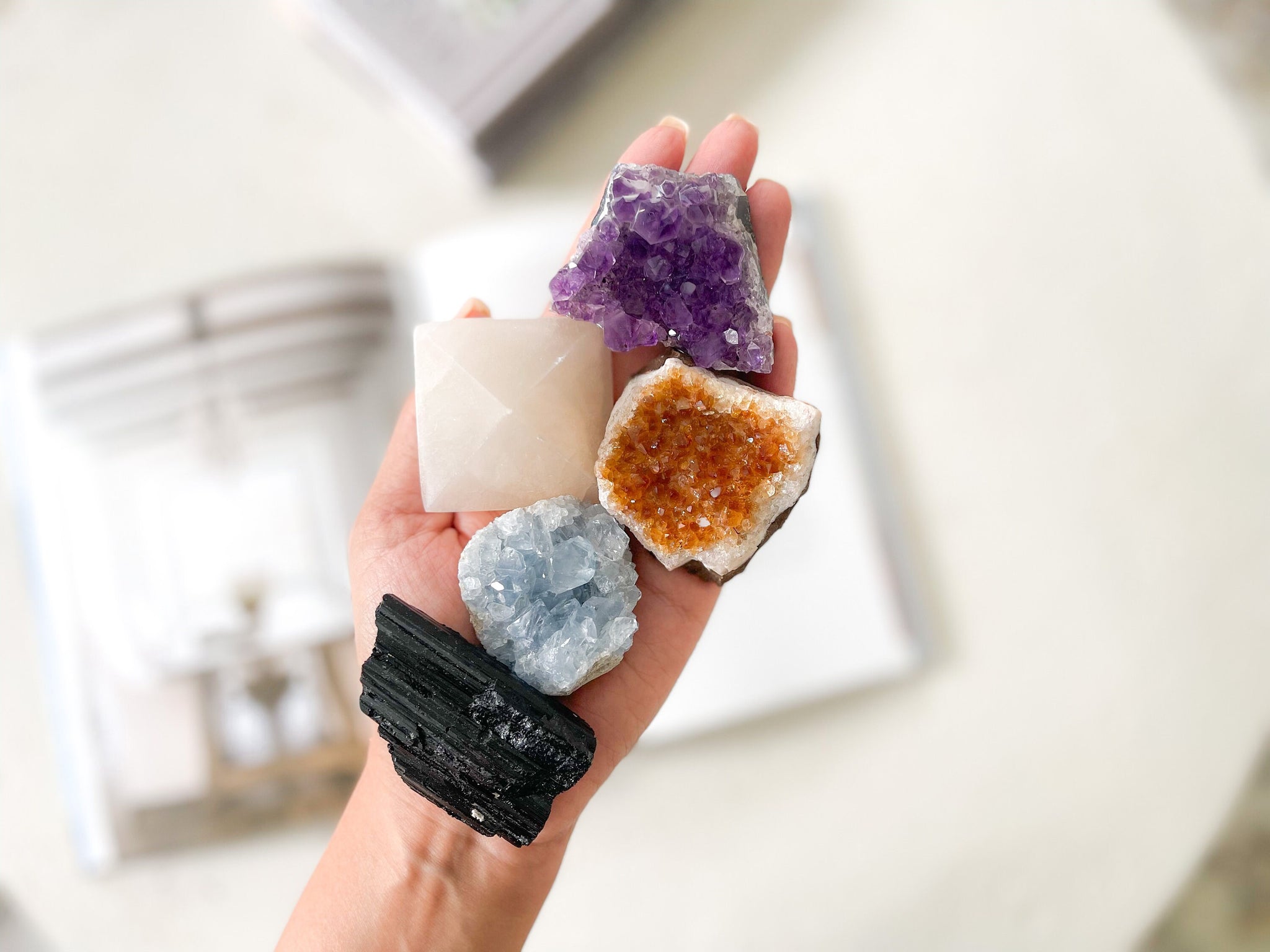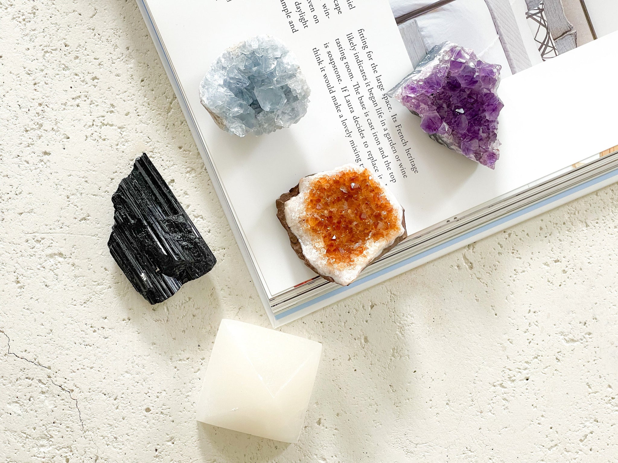 Each set includes an Amethyst Cluster, Citrine Cluster, Celestite Cluster, a Selenite Pyramid, and a rough chunk of Black Tourmaline. From the tranquility of Amethyst to the protective energy of Black Tourmaline, this collection offers a diverse array of crystal energies and aesthetics.
