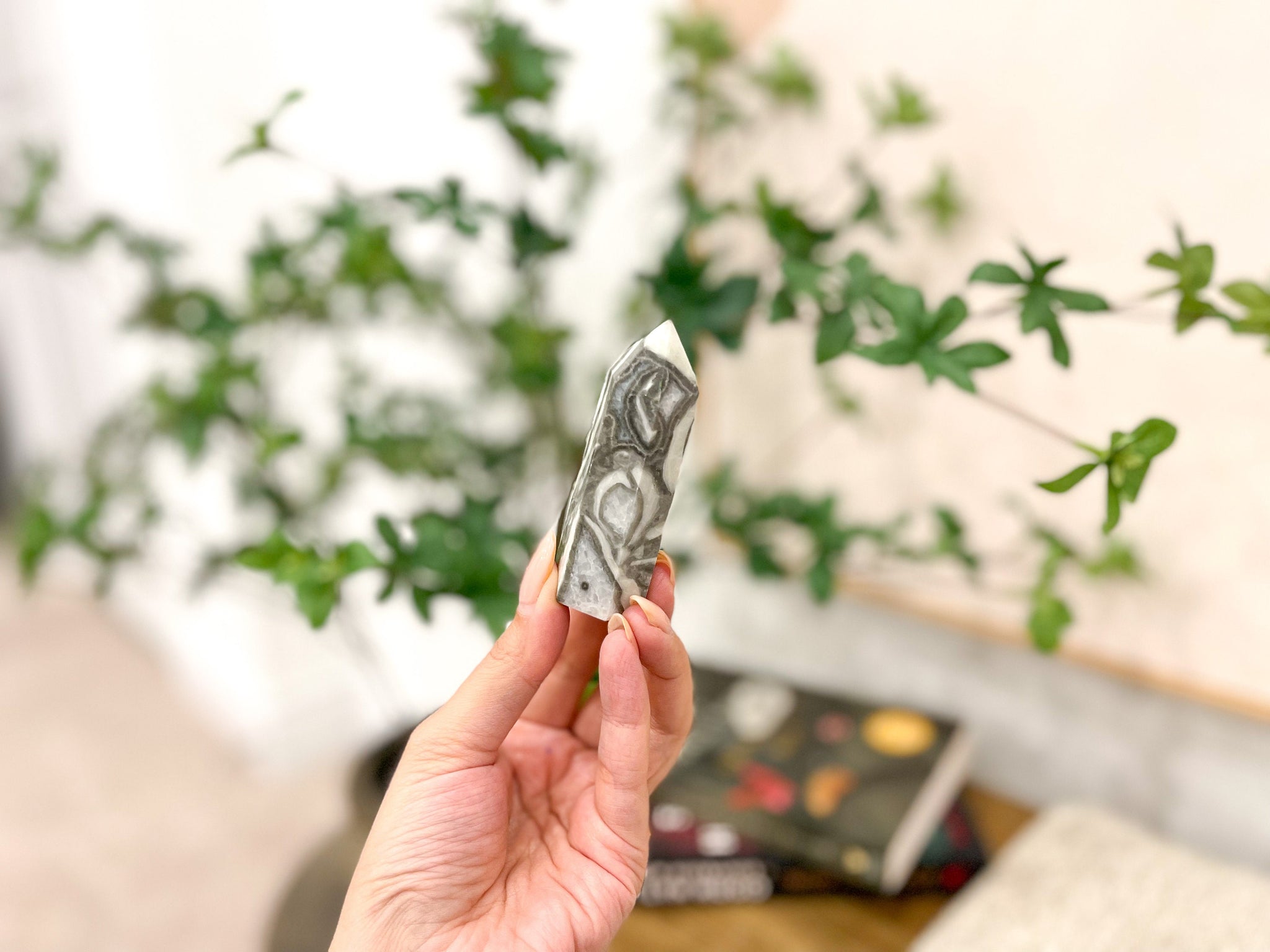 Elevate your crystal collection with our captivating Thousand Eye Jasper Point and Raw Amethyst Crystal Set. This powerful duo combines the protective and grounding energies of Thousand Eye Jasper with the calming, intuition-boosting properties of raw Amethyst. A perfect pairing for meditation, energy work, and spiritual growth.