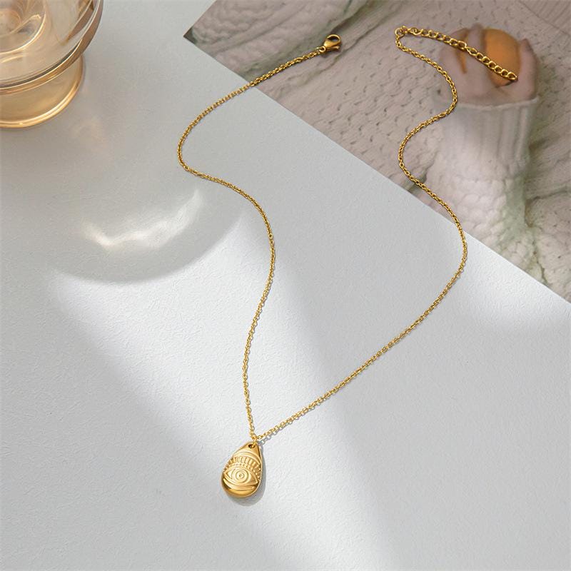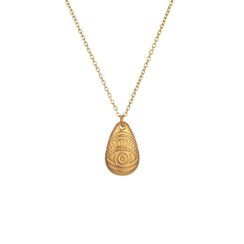 Channel protection and style with this 18K Gold Plated Evil Eye Protection Necklace. This teardrop-shaped pendant features an intricately engraved evil eye symbol, believed to ward off negative energy and bring good fortune to the wearer. The bold, mystical design makes it a standout piece, perfect for those who love jewelry with meaning and symbolism.
