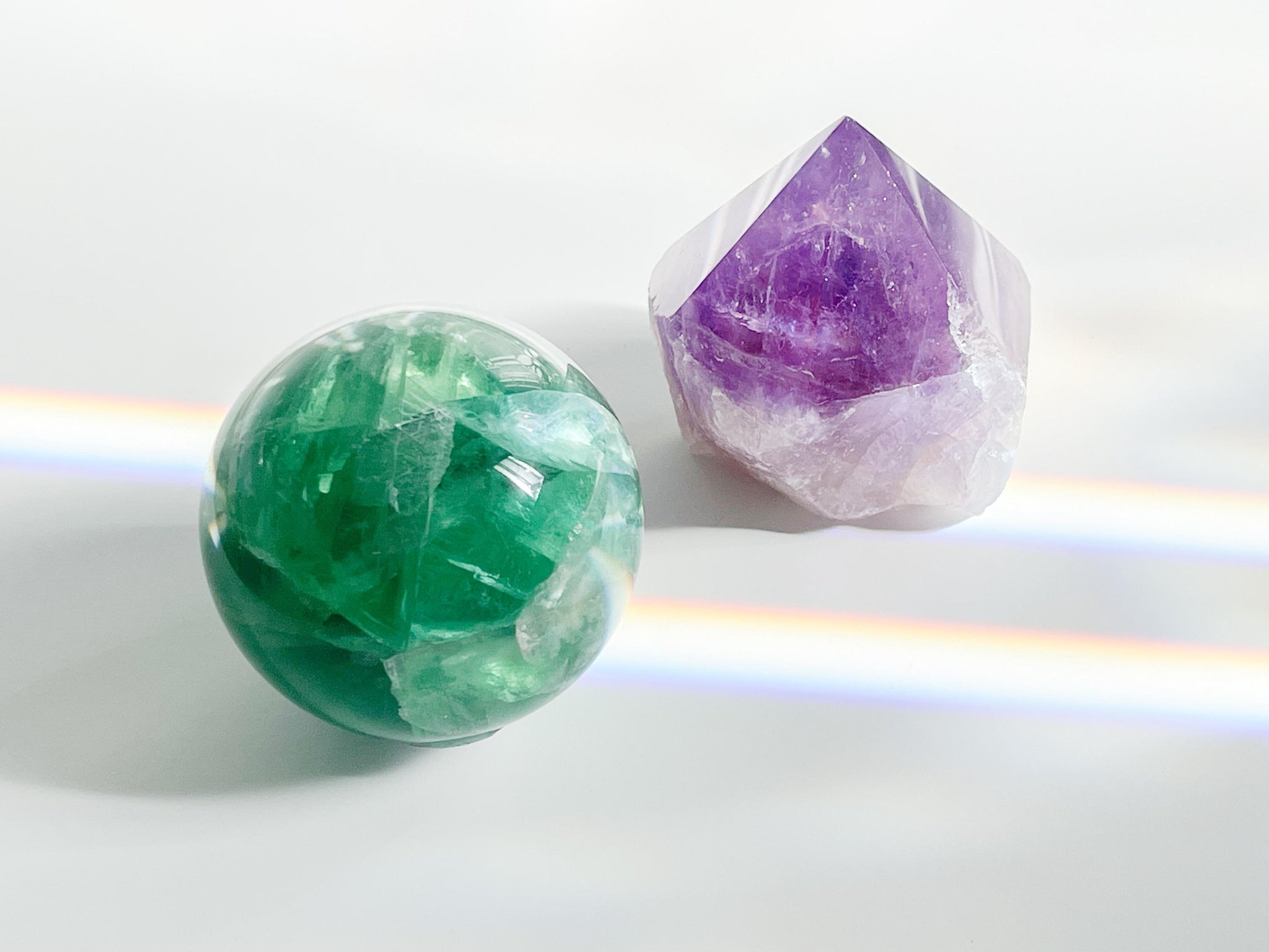 Elevate your energy and focus with this Fluorite Sphere & Amethyst Polished Point Set, complete with a mini selenite charging stand. This crystal kit is perfect for meditation, energy work, or as a thoughtful spiritual gift.