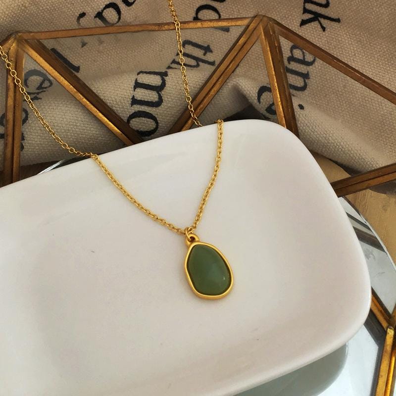 Green Jade Necklace, Gold Plated Necklace, Minimalist Jade Pendant, Geometric Necklace, Stainless Steel Jewelry, Everyday Necklace, Layering Necklace, Elegant Gift for Her, Adjustable Chain Necklace, Healing Stone Jewelry.