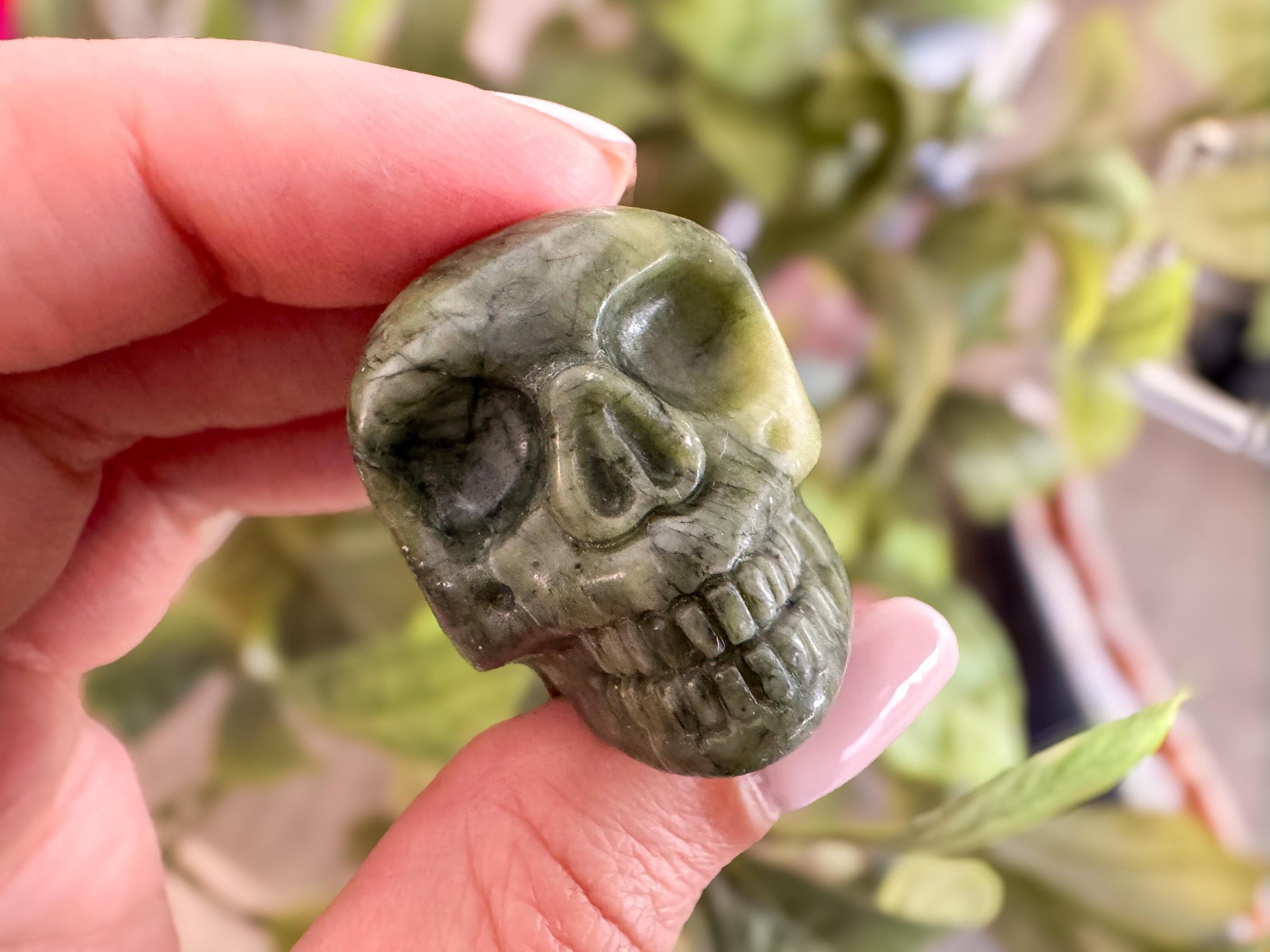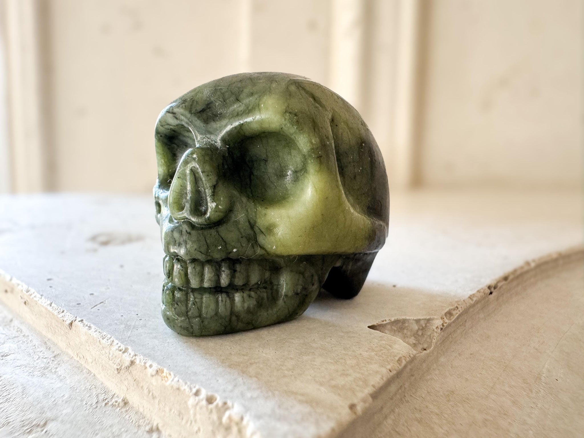 Embrace the ancient wisdom and transformative energy of this hand-carved 2 inch (5 cm) Green Serpentine Skull. Serpentine is a powerful healing stone associated with awakening the kundalini energy and clearing blocked chakras. Its earthy green tones connect deeply with nature and inner peace, making this skull a symbol of transformation, renewal, and protection.