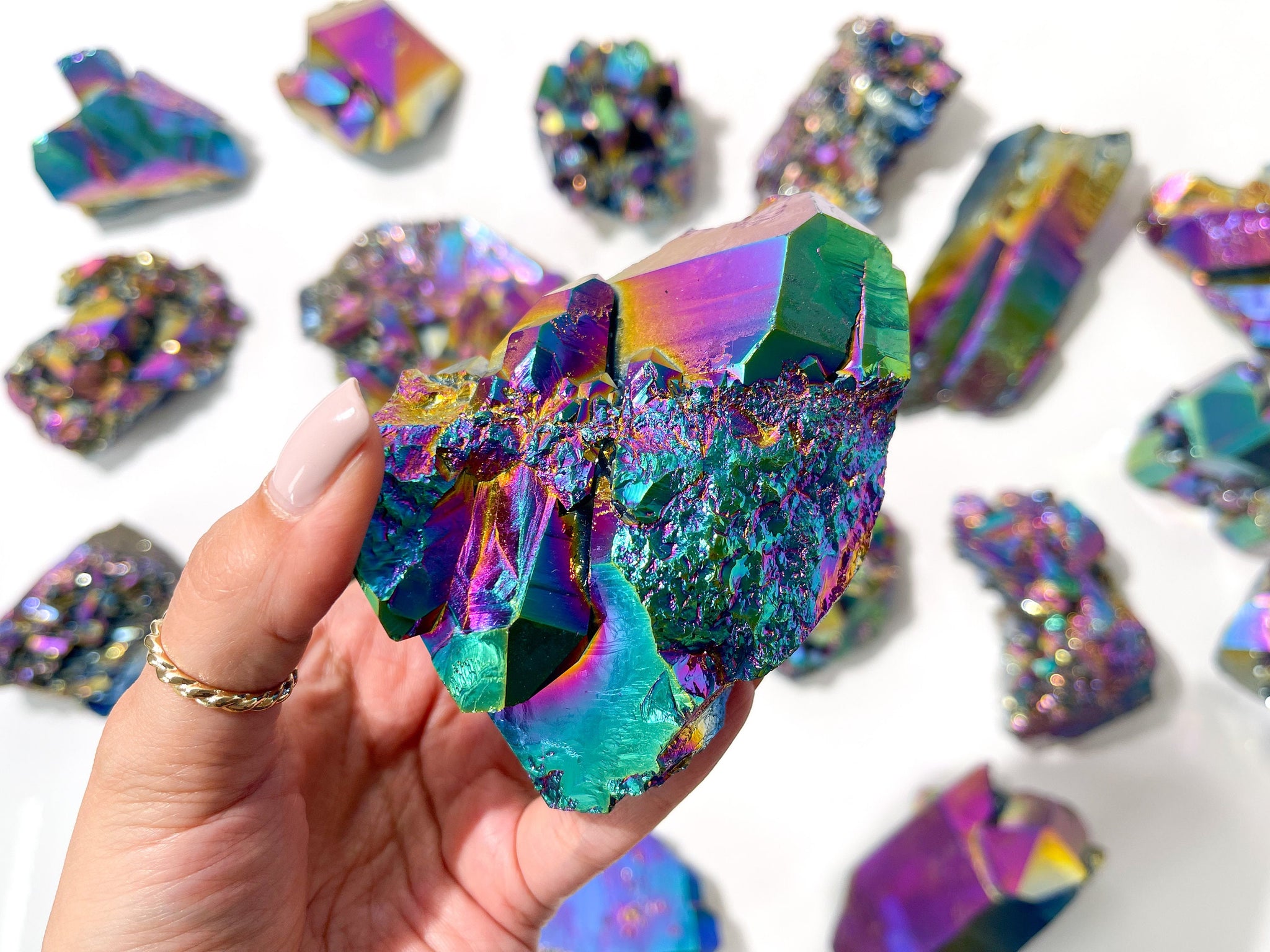 Aura Quartz is a popular gemstone that is known for its stunning iridescent colors. One of the most eye-catching forms of Aura Quartz is the large cluster, which can be found in a variety of colors, including Rainbow Titanium and Flame Aura. These clusters are stunning to look at and can add a touch of color and beauty to any room.