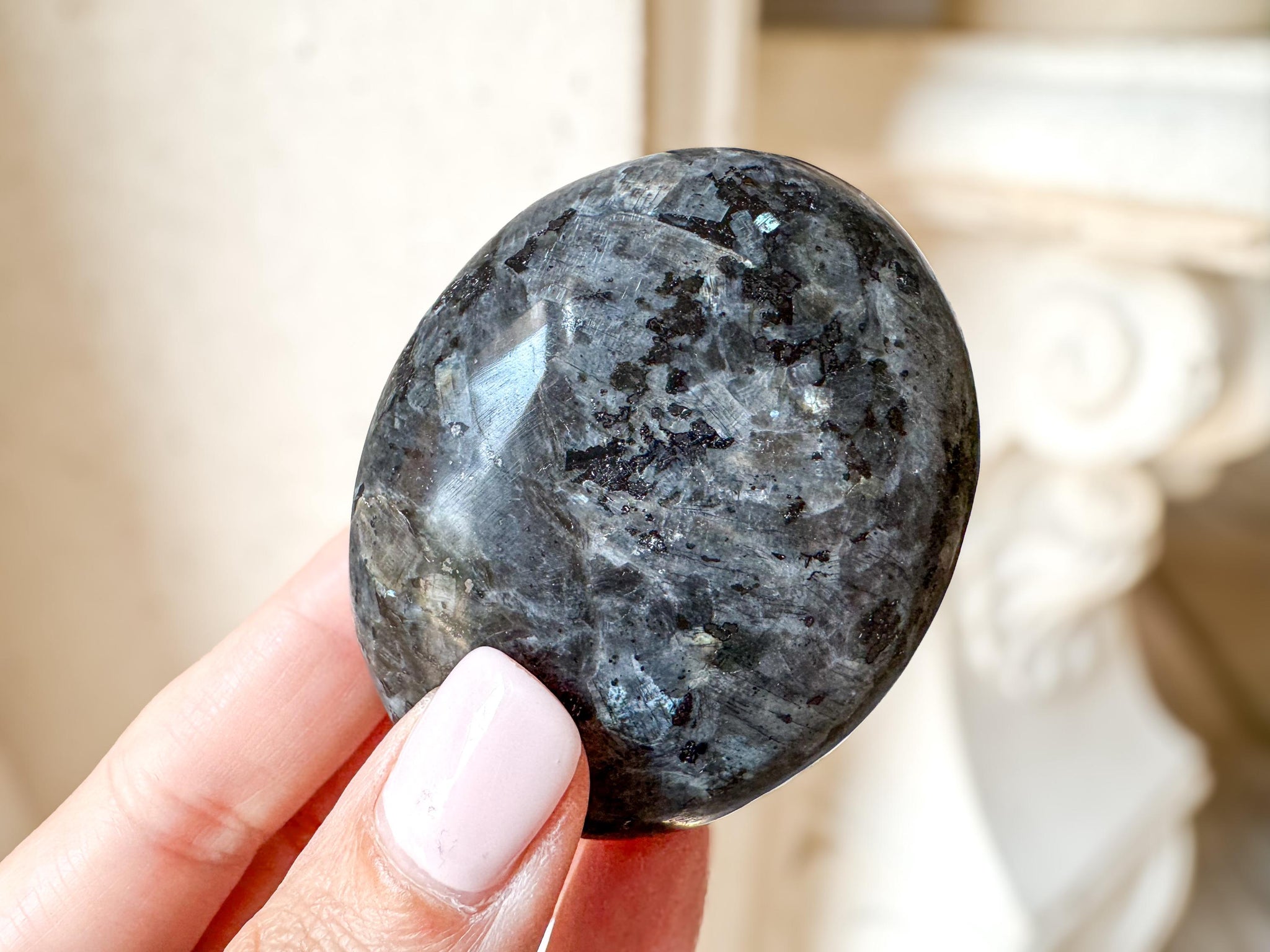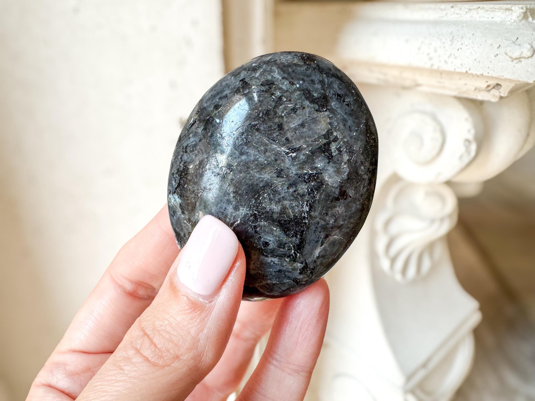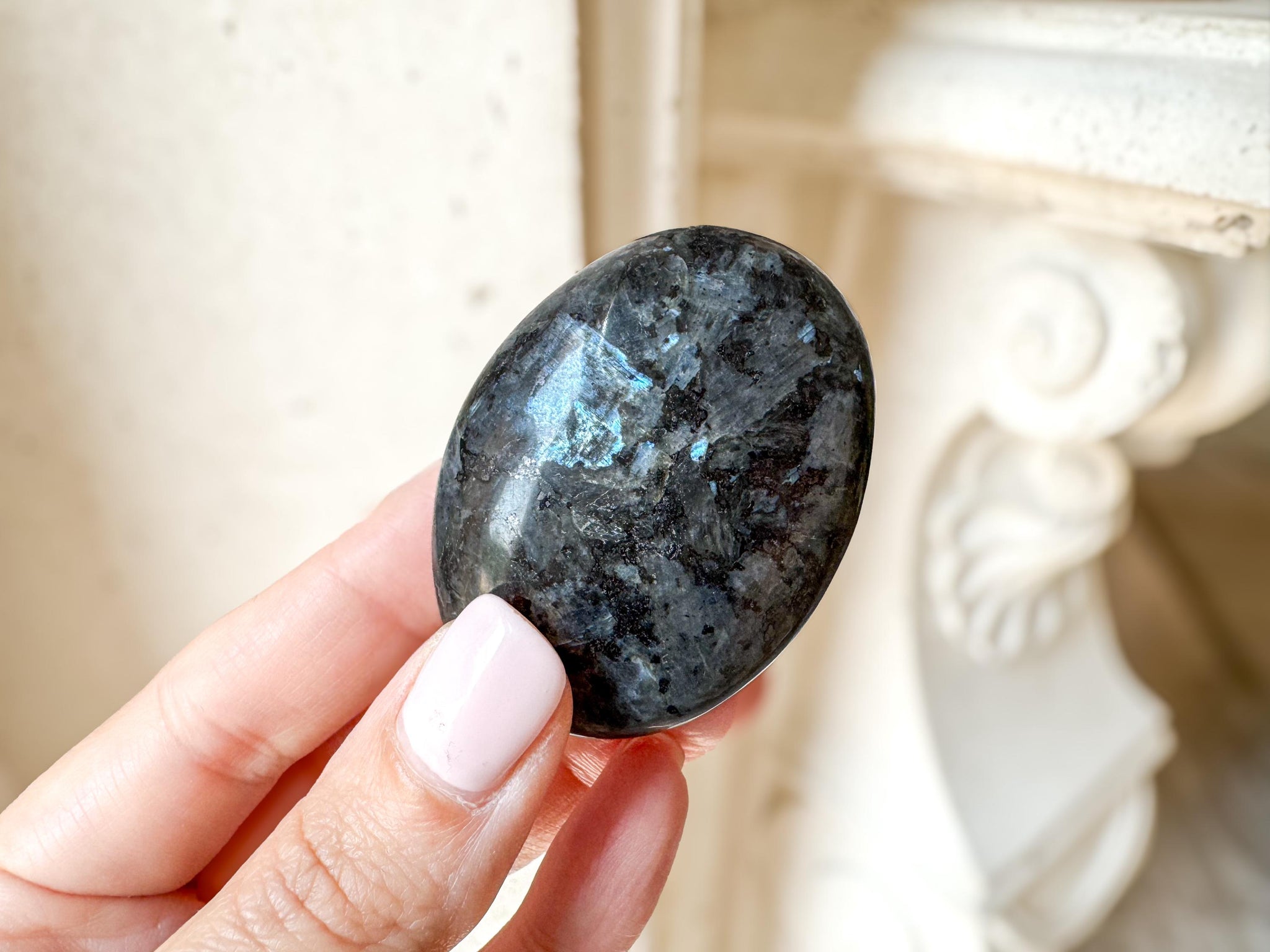 Embrace the protective and grounding energy of Larvikite with our hand-polished palm stones, available in three versatile sizes: Small (3-4 cm), Medium (4-5 cm), and Large (6-7 cm). This captivating black-grey stone is flecked with flashes of silver-blue that shimmer beautifully under light β a natural phenomenon known as schiller effect, unique to Larvikite.