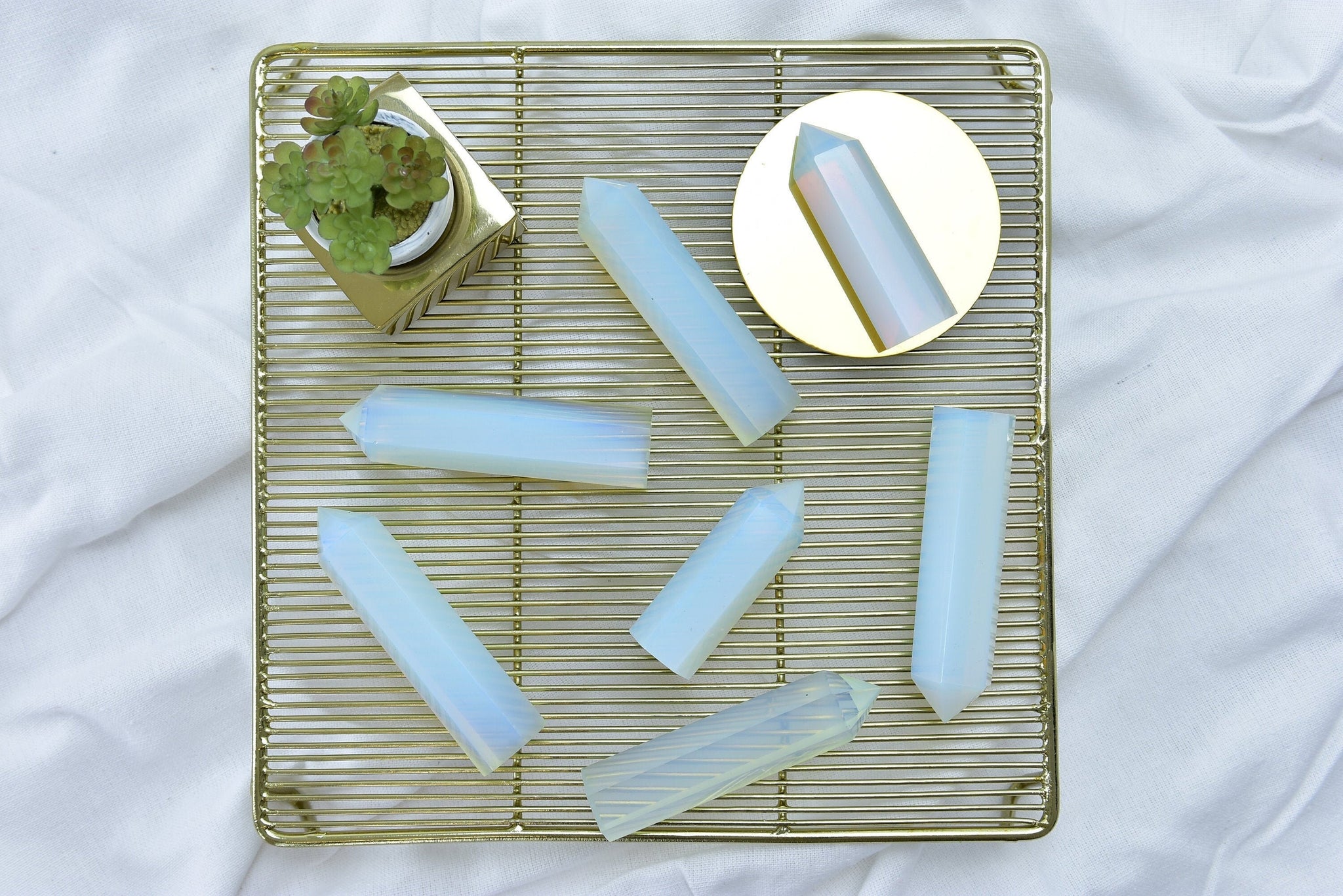 Opalite crystal points are powerful tools for healing and meditation. These beautiful, translucent stones have a soft, soothing energy that can help to calm the mind, reduce stress, and promote a sense of inner peace. The pointed shape of the crystal amplifies its energy, making it ideal for directing energy to specific points in the body. These points can be used during chakra healing or placed on areas that need extra support and healing. Whether you're a seasoned practitioner of crystal healing or just starting out, an opalite crystal point is a great addition to your collection. Its versatile energy makes it suitable for a wide range of uses, from clearing negative energy to promoting spiritual growth.