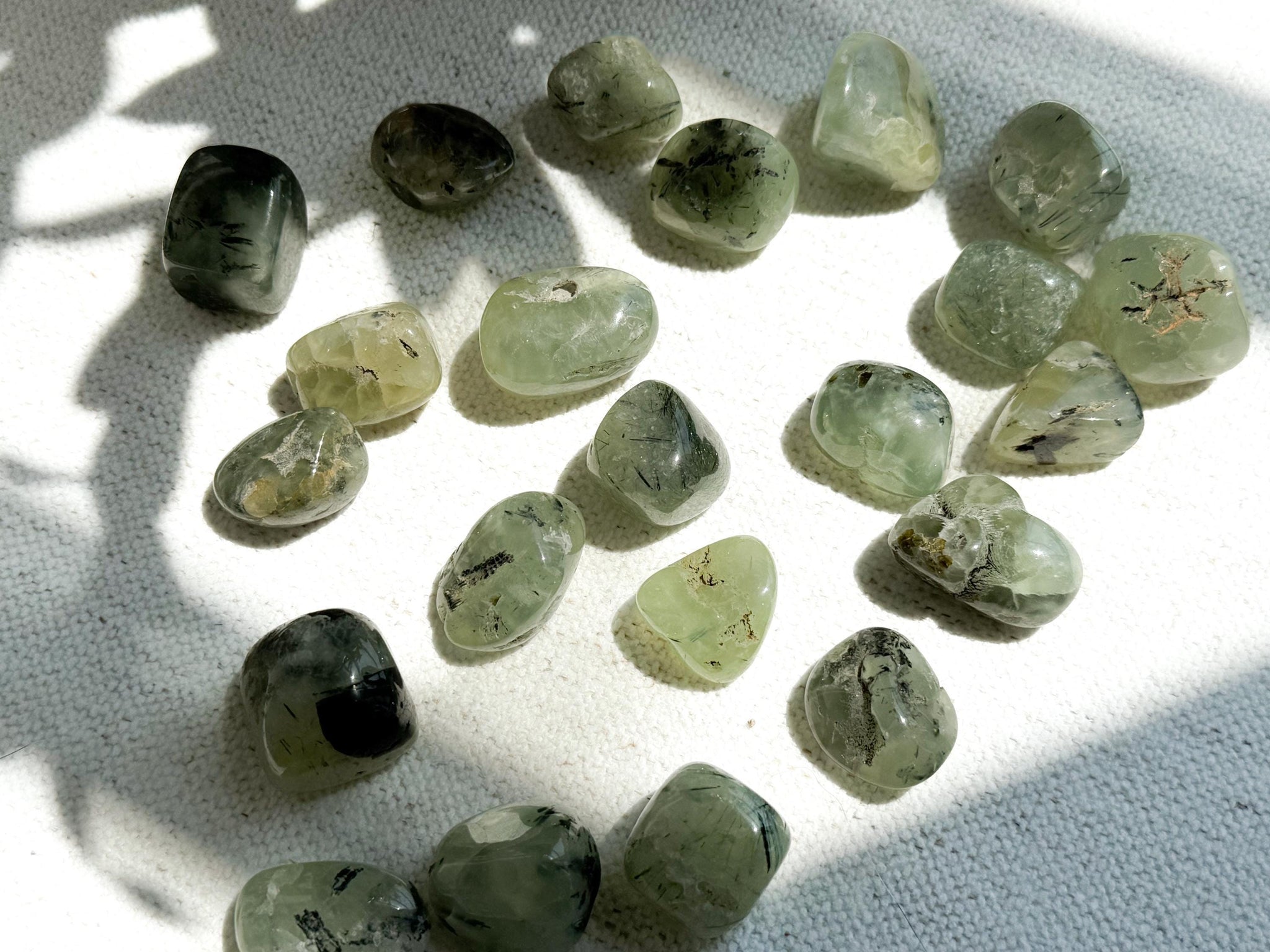 • Prehnite, often called Green Garnet or New Jade, is known for enhancing intuition, inner peace, and connection with spiritual guides