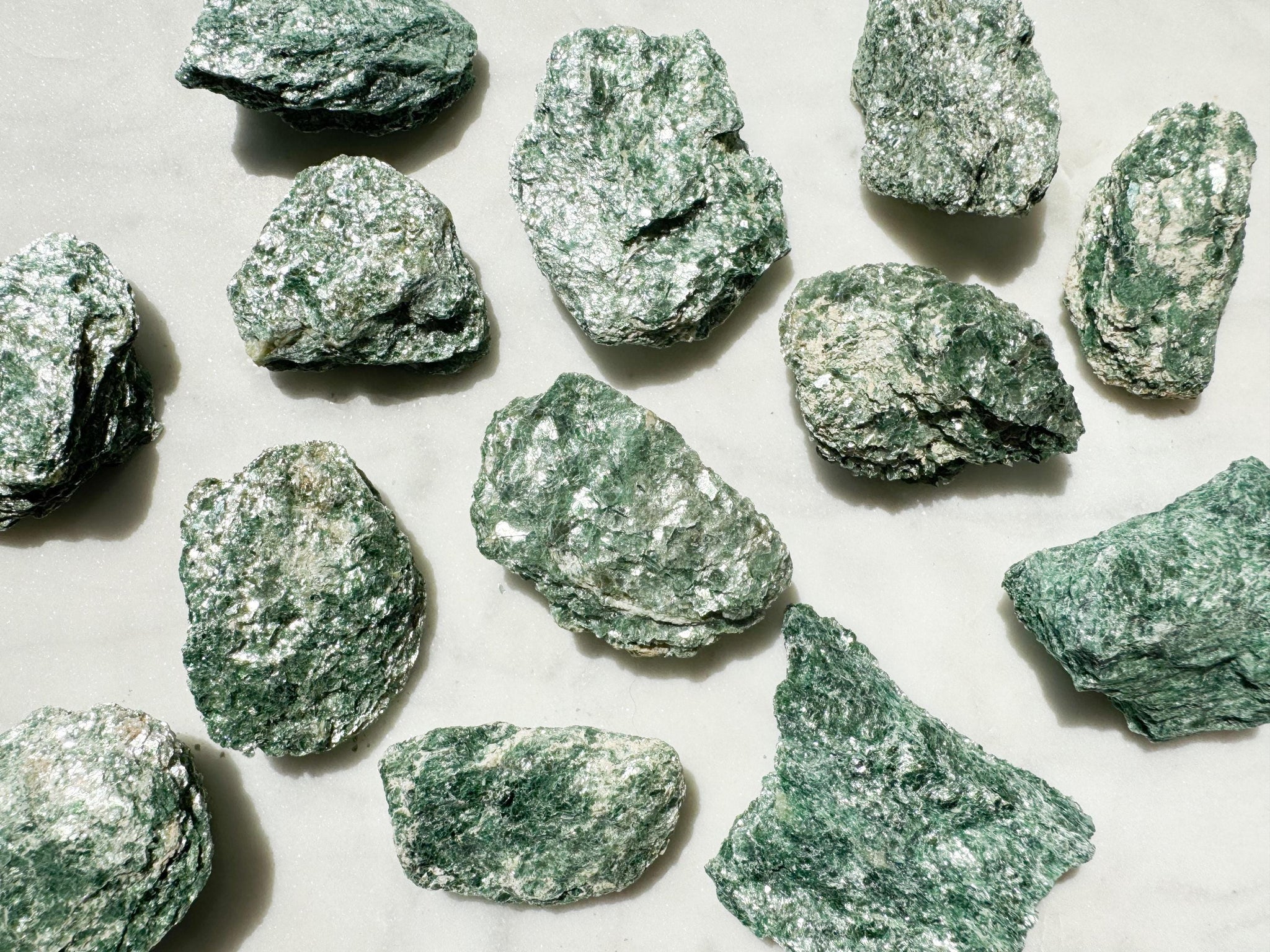 Bring calming, heart-centered energy into your home with these beautiful raw fuschite crystal chunks. Each shimmering green piece is naturally formed, ethically sourced, and hand-selected for its vibrant color and healing vibration. Fuschite is a powerful heart chakra stone, ideal for emotional balance, compassion, and spiritual growth 🌿💚. Perfect for Reiki, meditation, crystal grids, or as a unique mineral display.