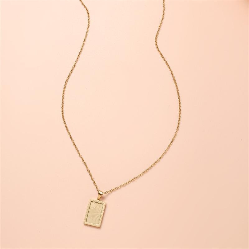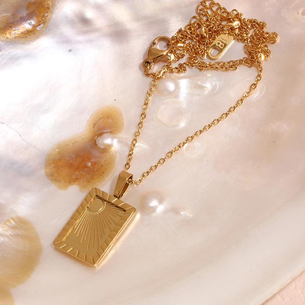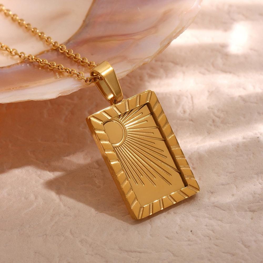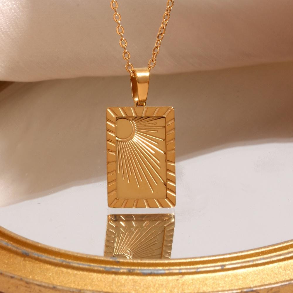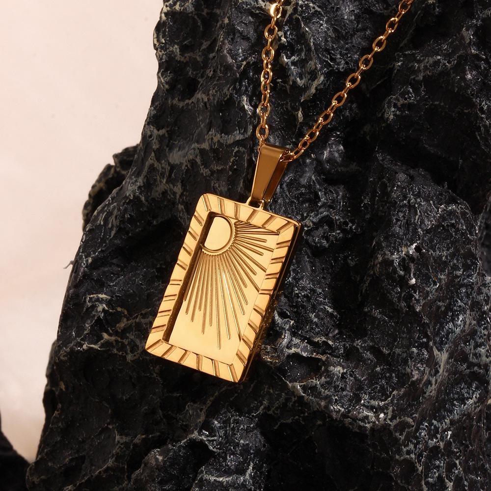 Embrace a touch of elegance with our Sunburst Pendant Necklace, crafted from high-quality stainless steel with a luxurious 18K gold plating. Featuring a beautifully engraved sunburst design, this pendant symbolizes positivity, strength, and new beginnings. Its minimalist, rectangular charm exudes sophistication, making it versatile for both everyday wear and special occasions.