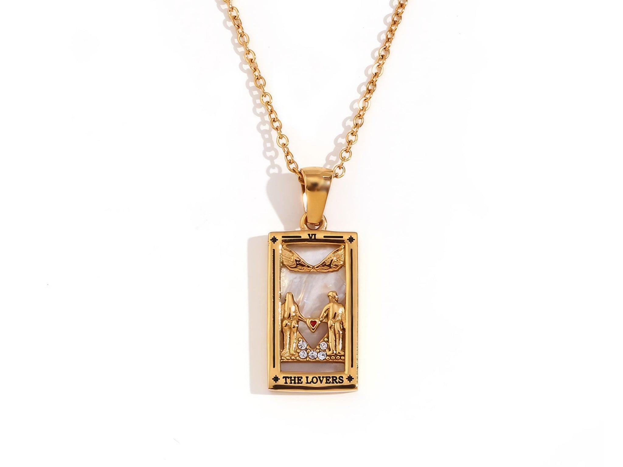 Celebrate connection and unity with The Lovers Tarot Card Necklace. This exquisite pendant, plated in 18K gold and adorned with mother of pearl and delicate crystal accents, captures the essence of The Lovers card. Representing love, harmony, and choice, this necklace is a beautiful reminder of the power of partnership and self-alignment.