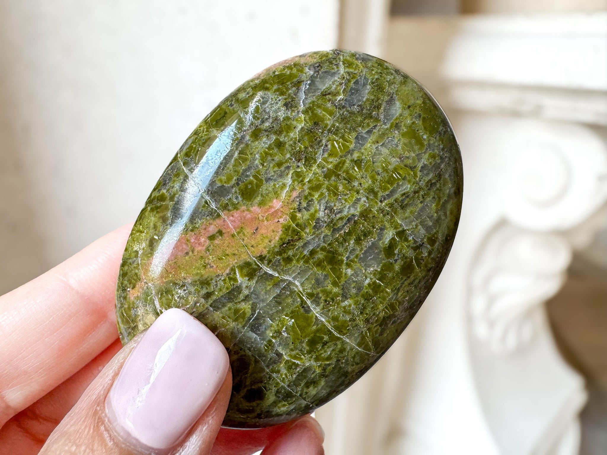 Bring harmony and emotional healing into your life with our hand-polished Unakite Palm Stones. Known for its powerful connection to the heart chakra, Unakite is a beautifully balanced crystal combining green epidote and pink feldspar. It's cherished for promoting emotional resilience, spiritual growth, and inner peace.