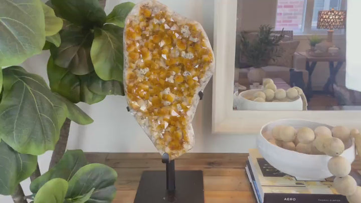 This magnificent XXL Citrine Cluster on a Metal Stand is a powerful statement piece for attracting wealth, abundance, and positive energy. This natural raw citrine cluster features vibrant golden points and is beautifully mounted on a sleek metal base, making it perfect for crystal collectors, feng shui, healing spaces, or elegant home and office décor. Known as the Stone of Abundance, Citrine is believed to enhance manifestation, creativity, confidence, and personal power while radiating warm, uplifting energy. Its impressive size and radiant color make it a true centerpiece that brings both visual beauty and high-vibrational energy into any environment. This is a one-of-a-kind specimen and you will receive the exact piece shown.